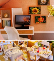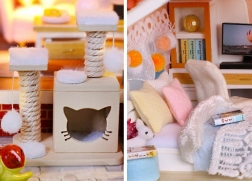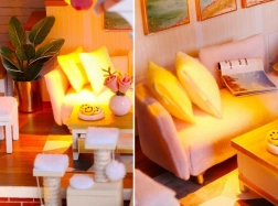 Model wykonano z połączenia drewna, papieru i tkaniny, dzięki czemu wygląda realistycznie i solidnie. Wnętrze zdobią miniaturowe meble i dekoracje, które podkreślają atmosferę małego domu. Światła LED (zasilanie 2× AAA, brak w zestawie) dodają scenerii życia i wieczorem tworzą przyjemny nastrój.