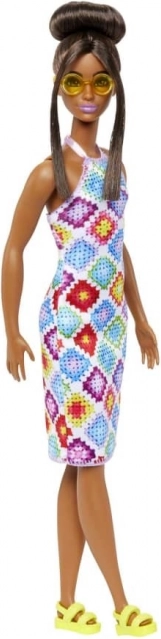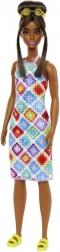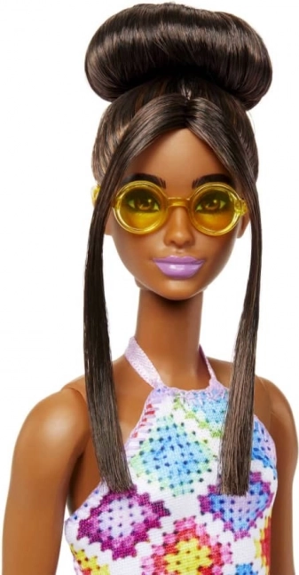 Lalka BARBIE Fashionistas celebruje różnorodność i indywidualny styl. Ma na sobie wyrazistą sukienkę z geometrycznym, patchworkowym wzorem, która rozświetli nawet pochmurny dzień. Elegancką fryzurę z kokiem i pasmami wokół twarzy uzupełniają stylowe okulary i modne sandały – gotowa na każdą przygodę.