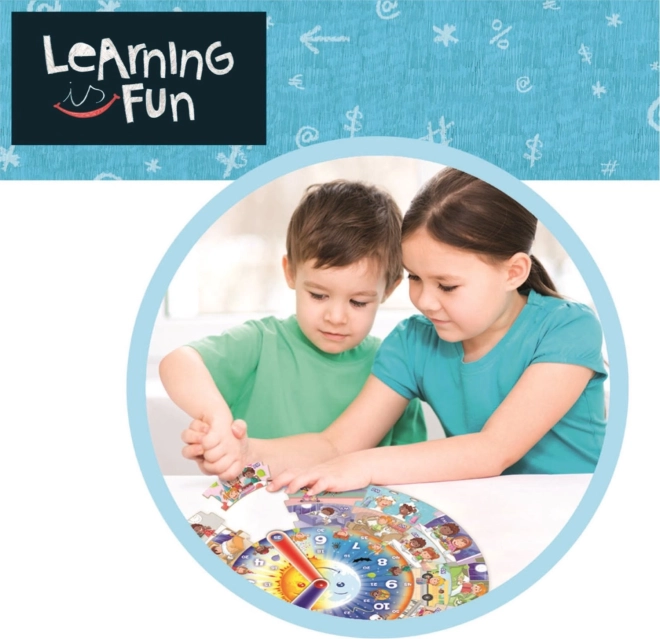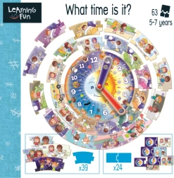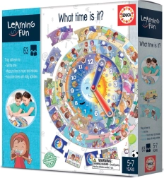 Educa Learning to Zabawa pomaga dzieciom opanować codzienne umiejętności związane z używaniem zegara i zaznajamia je z czynnościami w ciągu dnia. Gra zawiera duże okrągłe puzzle z 39 elementami i zegarem z wskazówkami, co pozwala na integrację myślenia logicznego i motoryki precyzyjnej.