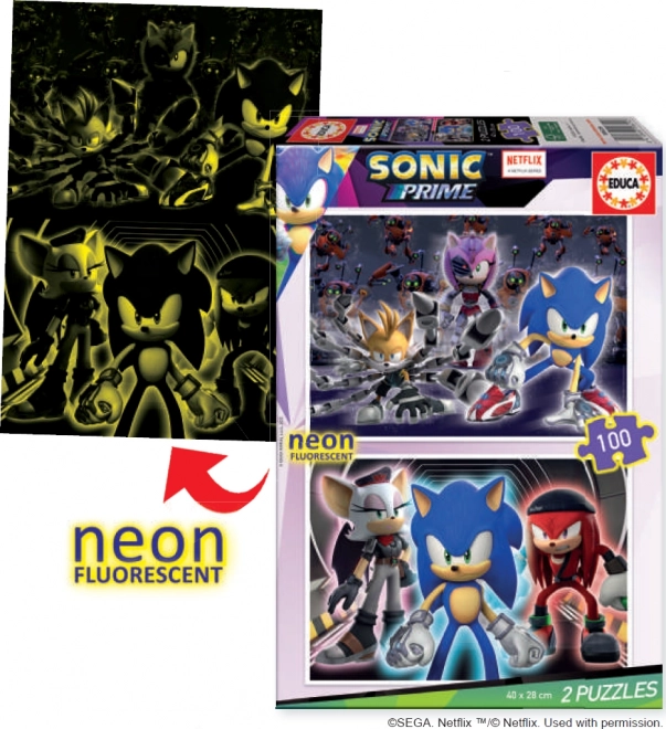 Ciesz się zabawą z dwoma neonowymi puzzlami Sonic Prime od EDUCA, które świecą w ciemności dzięki specjalnej fluorescencyjnej warstwie. Każde puzzle ma 100 elementów i wymiary 40 x 28 cm.
