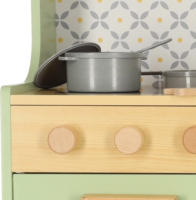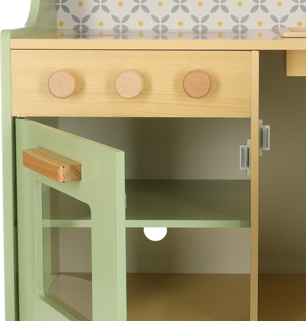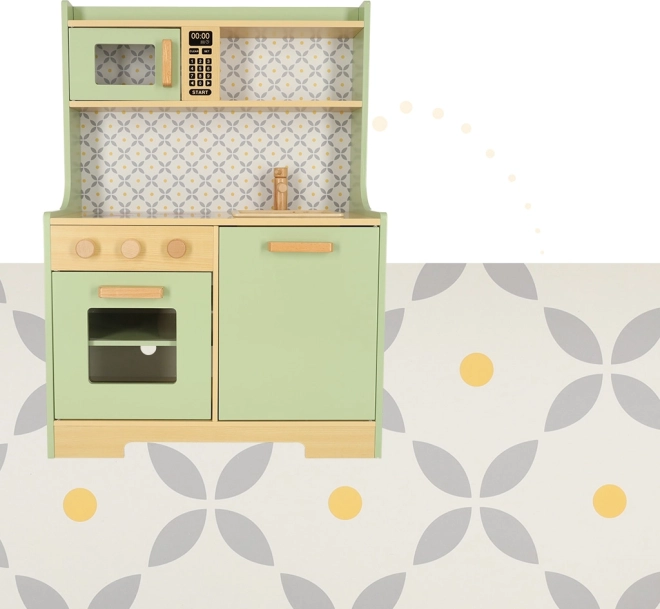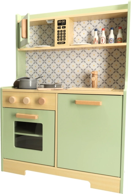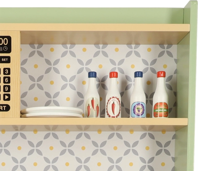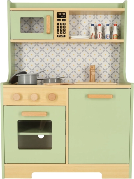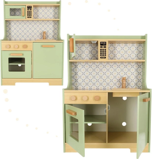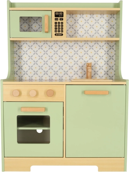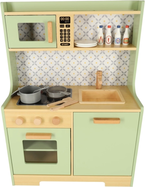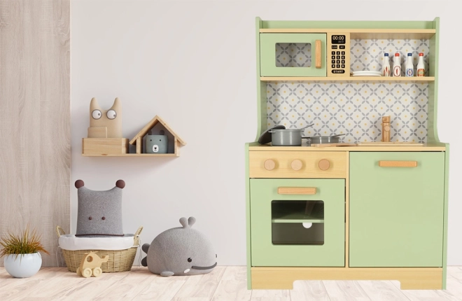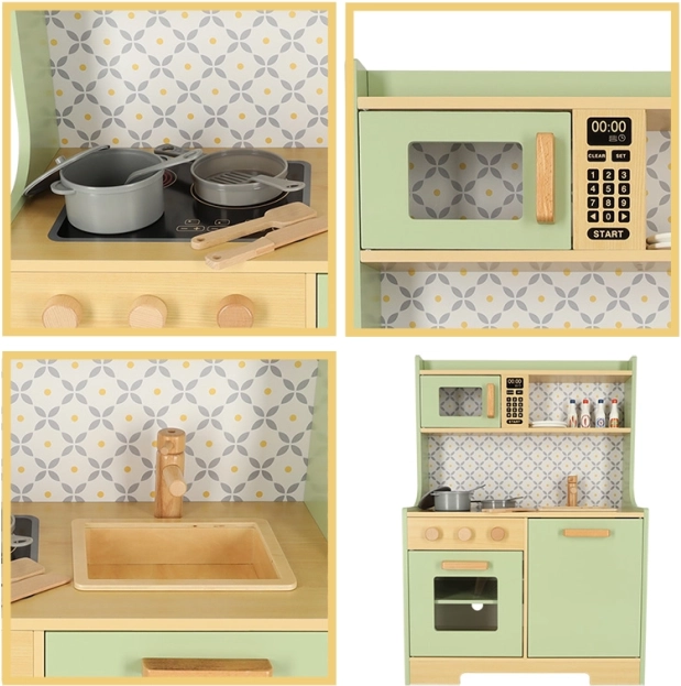 Pozwól dzieciom naśladować rodziców w bezpiecznym środowisku z miętowo-zieloną drewnianą kuchnią. Zawiera wszystkie niezbędne elementy, takie jak piekarnik, kuchenkę mikrofalową, ruchomą płytę kuchenną i zlew, które wydają realistyczne dźwięki, aby symulacja gotowania była jak najbardziej autentyczna.