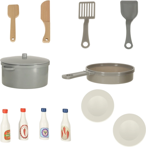Zestaw zawiera bogaty zestaw akcesoriów, w tym plastikową patelnię, garnek z pokrywką, drewniane sztućce i talerze. Nie brakuje także czterech różnych rodzajów sosów do wykańczania potraw.