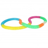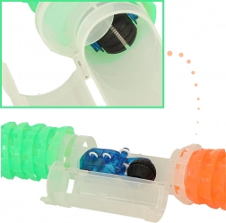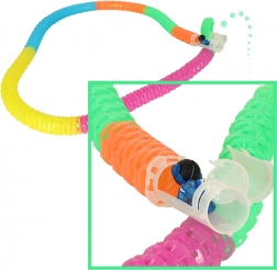 Kreatywny system łączenia pozwala budować tor w dwóch trybach: luźnym dla elastycznych zakrętów lub sztywnym dla stabilnych, pionowych konstrukcji. Autko, dzięki wbudowanemu oświetleniu, zapewnia świetny efekt o zmierzchu i gwarantuje widowiskową zabawę.