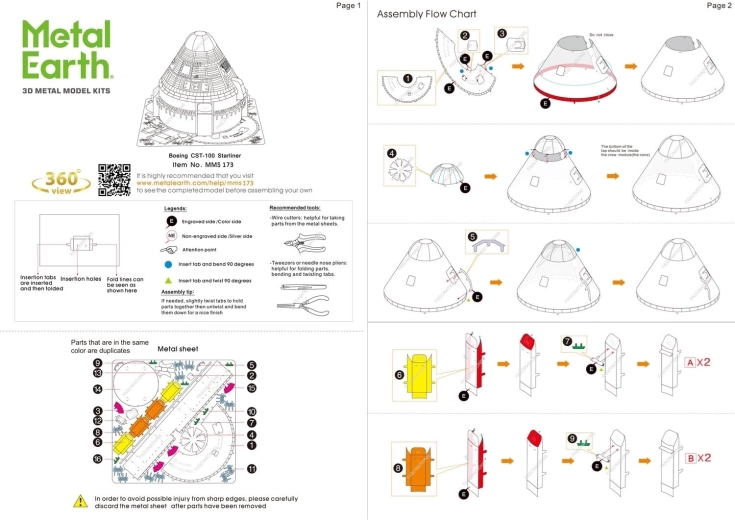 Wyjmij poszczególne elementy z metalowych arkuszy; w razie potrzeby użyj małych cęgów tnących (nie wchodzą w skład zestawu). Elementy łączy się za pomocą zamków tworzonych przez zaczep (języczek) i otwór. Zegnij języczek przy pomocy małych, cienkich szczypiec (nie wchodzą w skład zestawu) i kolejno połącz wszystkie zamki, aż powstanie bardzo realistyczne dzieło!