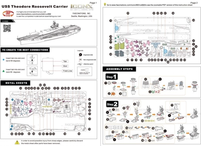 Składanie odbywa się ze stalowych arkuszy z wytłoczonymi elementami. Poszczególne części łączy się za pomocą zamków i zaginanych zaczepów, więc nie potrzebujesz kleju. W opakowaniu znajdziesz także pęsetę i przejrzystą instrukcję. Dla wygodniejszej pracy zalecane są małe cęgi tnące i cienkie szczypce płaskie (nie wchodzą w skład zestawu). Rekomendowany wiek to 14+.