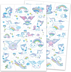 Tymczasowe tatuaże DJECO z motywami jednorożców to idealny wybór na dziecięce przyjęcia, karnawał i codzienną zabawę. Dzieci mogą ozdobić ręce, twarz i nogi wesołymi, delikatnymi obrazkami, które zostały dermatologicznie przetestowane dla bezpiecznego użytkowania.