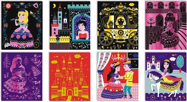 Zestaw zawiera osiem wstępnie narysowanych kart z księżniczkami, zamkami i magicznymi sceneriami. Każdy motyw inspiruje dzieci do tworzenia i opowiadania własnych historii.