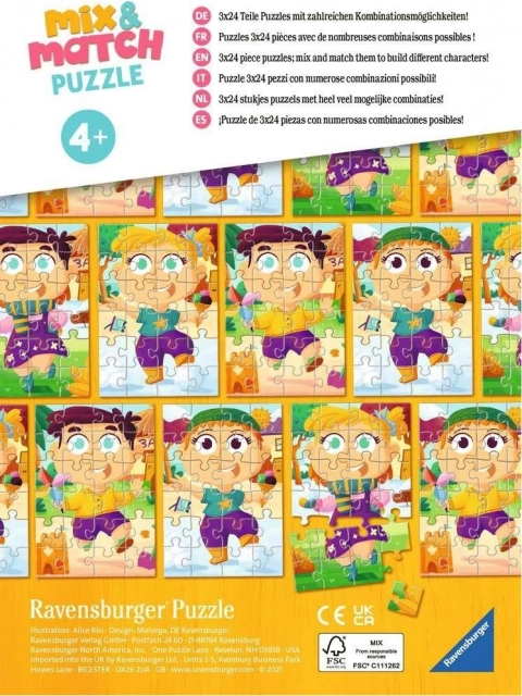 Układaj i mieszaj elementy, tworząc zabawne postacie! Ten zestaw od Ravensburger oferuje trzy puzzle po 24 elementy z motywem kolorowych sukienek. Dzieci mogą układać według wzoru lub łączyć elementy pomiędzy wszystkimi trzema układankami, tworząc oryginalne obrazki. Świetna zabawa, która rozwija motorykę małą, cierpliwość i kreatywność.