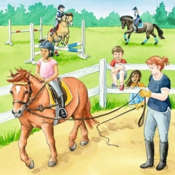 Zestaw trzech puzzli RAVENSBURGER Dzień u koni oferuje dzieciom różne sceny z jeździeckiego świata – od opieki w stajni po radość z jazdy w plenerze. Każde puzzle ma 49 elementów, które doskonale do siebie pasują i są przyjemne w dotyku. Dzięki wysokiej jakości nadrukowi i solidnemu kartonowi układanie można powtarzać wielokrotnie.