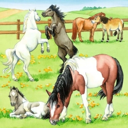 Dzieci w przystępny sposób poznają, jak dbać o konie – czyszczenie, karmienie i praca w stajni. Motyw wspiera empatię i relację ze zwierzętami.