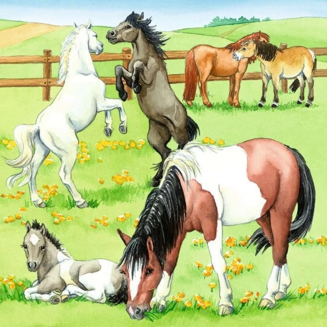 Sielska scena z końmi na zielonej łące ucieszy miłośników zwierząt i wesprze postrzeganie kolorów oraz detali. Idealne na spokojne popołudniowe układanie.
