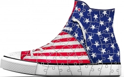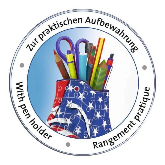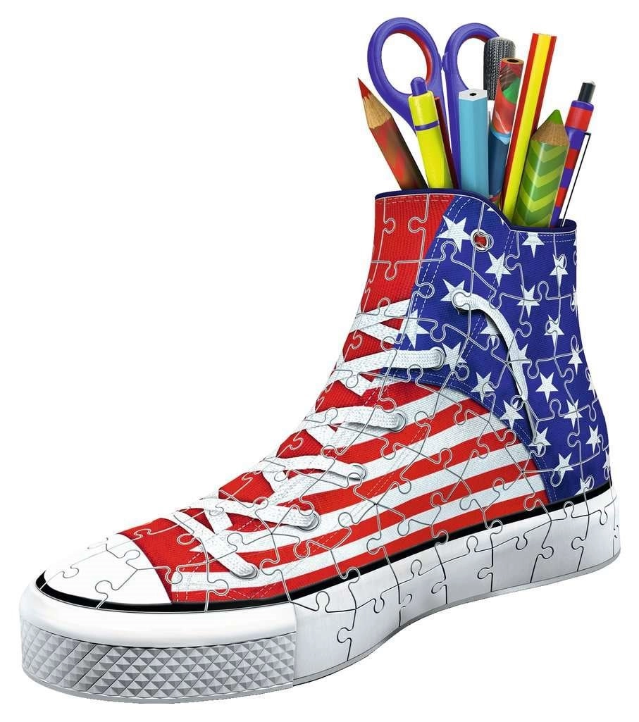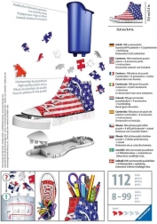 Genialne połączenie dla miłośników sneakersów i układanek! Ułóż 3D puzzle o nietypowym kształcie, które ożywią Twój stół... RAVENSBURGER stworzył 3D trampki, które można wykorzystać jako oryginalne pojemniki na długopisy, kredki czy pędzle. Specjalne wyprofilowane lub elastyczne elementy, które idealnie pasują na swoje miejsce, pozwalają zbudować designerskiego trampka z nadrukiem amerykańskiej flagi, wyglądającego bardzo realistycznie. Elementy wykonane są z solidnego plastiku i zapewniają doskonałą stabilność. Trampki utrzymują kształt bez konieczności klejenia. Zawartość opakowania: 108 ponumerowanych elementów puzzli, 4 elementy akcesoriów oraz instrukcja. Zawartość trampka pokazana na zdjęciu nie jest częścią zestawu. Wymiary złożonej układanki ok. 21,4 × 13,5 cm