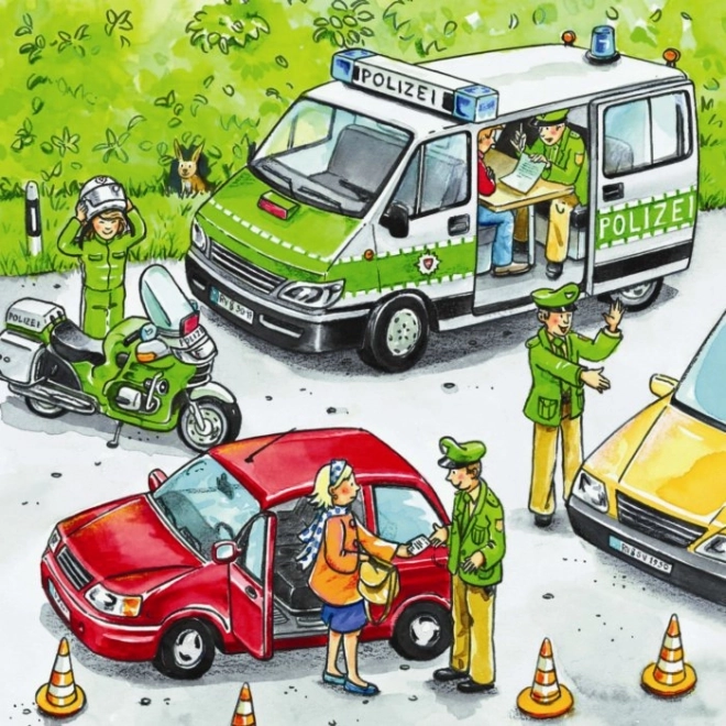 Ten zestaw trzech puzzli z motywami pojazdów policyjnych i akcji interwencyjnych daje dzieciom radość z układania oraz rozwija małą motorykę, logiczne myślenie i cierpliwość. Każde puzzle po ułożeniu ma wymiary około 17,8 × 17,8 cm, a dzięki precyzyjnemu wykrojowi typowemu dla RAVENSBURGER elementy doskonale do siebie pasują.