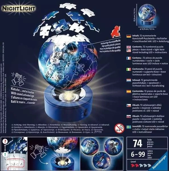 Dzięki nocnej edycji Nachtlicht od Ravensburgera także Twoje dziecko może mieć urzekającą świecącą kulę z motywem kosmicznym. Puzzle są bardzo lubiane nie tylko dzięki łatwej manipulacji, ale także stabilności. Do układania nie potrzebujesz kleju – specjalnie wyprofilowane zakrzywione elementy po prostu do siebie pasują i trzymają kształt. Układać można według obrazka lub numerów – plastikowe elementy są ponumerowane od spodu. Średnica puzzleballu wynosi 13 cm. Opakowanie zawiera: - 72 elementy - stojak - podstawę z żarówką LED - krótka instrukcja Baterie nie są częścią produktu. Ravensburger słusznie należy do czołowych europejskich producentów puzzli, łamigłówek, gier i innych produktów dla dzieci. Obecnie w swoim portfolio ma około 8000 różnych produktów. Polityką firmy jest oferować sens i przynosić radość nie tylko najmłodszym. Wysoka jakość jest wynikiem wieloletniego doświadczenia, wiedzy i umiejętności w procesie produkcji, wraz z wykorzystaniem materiałów najwyższej jakości. Nie mniej ważna jest także ścisła kontrola i bezpieczeństwo pracy. Wymiary ułożonej kuli: średnica ok. 13 cm