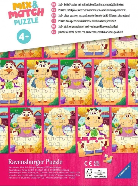 Odkryj sprytne połączenie klasycznego układania i kreatywnego mieszania. Puzzle RAVENSBURGER Mix & Match: Moi przyjaciele z farmy oferują trzy oddzielne obrazki po 24 elementy, które dzieci mogą układać według wzoru lub ze sobą łączyć. Dzięki temu powstają nowe i śmieszne wariacje zwierzątek i postaci z farmy.