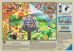Ravensburger „I Like Birds – Birdie Seasons” to wspaniała 1000-elementowa układanka, która wprowadza do Twojego domu kawałek przyrody. Ilustracja obejmuje gatunki ptaków, takie jak czyżyk, drozd, trznadel i sikorka, wyróżnione sezonowymi kwiatami. Ten artystyczny kawałek jest dziełem Stuarta Coxa, znanego ze swojej pasji do przyrody i szczegółowego designu.