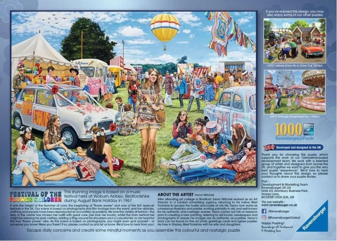 Zrelaksuj się z wysokiej jakości puzzlami RAVENSBURGER z motywem „Festiwal dzieci‑kwiatów”. Układanka z 1000 elementów oferuje delikatnie ilustrowaną scenę, precyzyjne elementy SoftClick oraz po ułożeniu format ok. 70 × 50 cm.