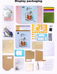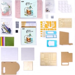 Zestaw dostarczany jest w częściach i zawiera wszystkie niezbędne narzędzia, w tym klej, farby i pędzelek. Podczas budowy pracuje się głównie z już przyciętymi elementami ze sklejki, a także z elementami kartonowymi i materiałowymi. Do wygodnego montażu oświetlenia polecamy użyć szczypiec półokrągłych, ale wystarczą też zwykłe nożyczki.