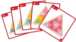 W zestawie znajduje się 5 dwustronnych kart o różnym poziomie trudności. Dzieci mogą układać według instrukcji lub tworzyć własne mozaiki.