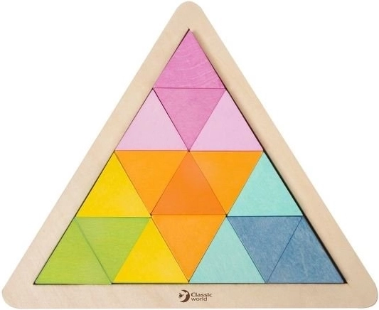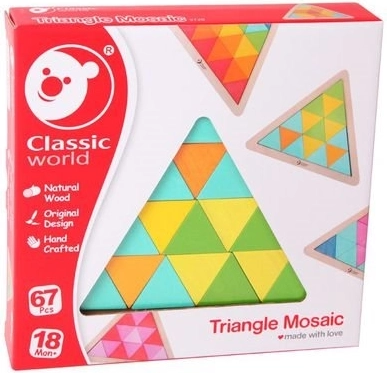Odkryj angażującą, edukacyjną zabawkę, która wspiera dziecięcą wyobraźnię i koncentrację. Drewniana mozaika trójkąt CLASSIC WORLD oferuje kolorowe trójkąciki, z którymi dzieci łatwo tworzą wzory i obrazki w solidnej drewnianej ramie lub poza nią. Dzięki dwustronnym kartom z wzorami mogą zaczynać od prostszych motywów i stopniowo zwiększać trudność.
