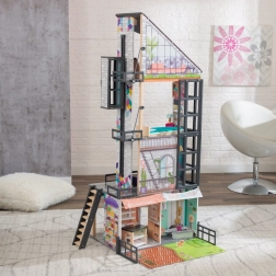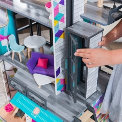 Czteropiętrowy miejski domek dla lalek z realistycznymi detalami, basenem na dachu i ruchomą windą zapewnia dzieciom godziny kreatywnej zabawy. Oferuje 6 scenariuszy zabawy, 26 elementów mebli, efekty świetlne i dźwiękowe oraz zabawę z obu stron dzięki dostępowi 360°. Wysokiej jakości wykonanie z materiału drewnianego od KIDKRAFT jest idealne dla lalek do 30 cm.