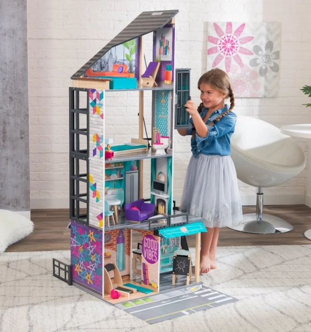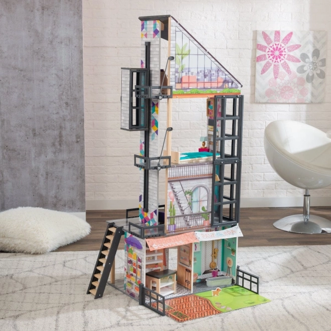 Odkryj wielkomiejską przygodę z domkiem dla lalek KidKraft Bianca City Life. Ten designerski dom typu „loft”, przypominający drapacz chmur, łączy nowoczesny wygląd z trwałym, drewnianym wykonaniem. Kolorowe, graficzne tła, funkcjonalne elementy i otwarty dostęp 360° wspierają wspólną zabawę większej liczby dzieci i nieskończoną wyobraźnię.