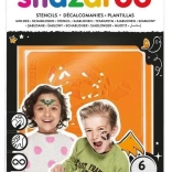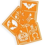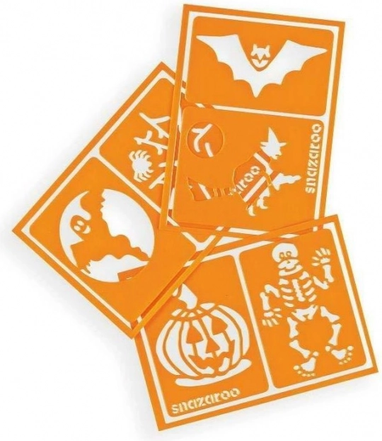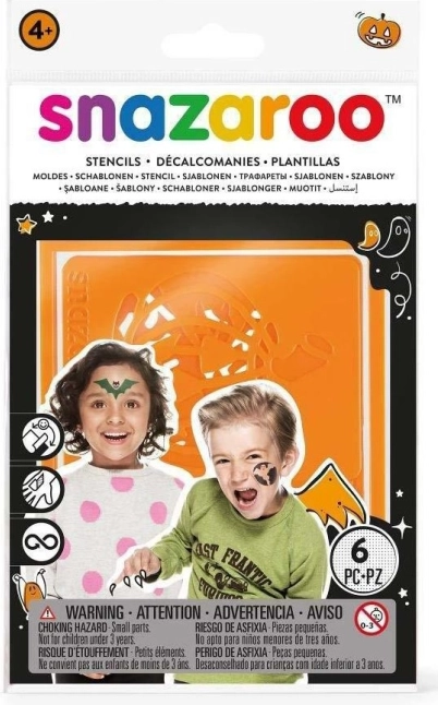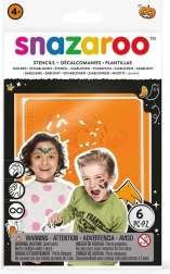 Zestaw sześciu szablonów SNAZAROO do łatwego i szybkiego malowania twarzy oraz ciała. Motywy tematyczne na Halloween, samoprzylepny spód dla stabilności, elastyczny materiał dopasowujący się do krzywizn oraz wielokrotne użycie dzięki zmywalnemu wykonaniu.