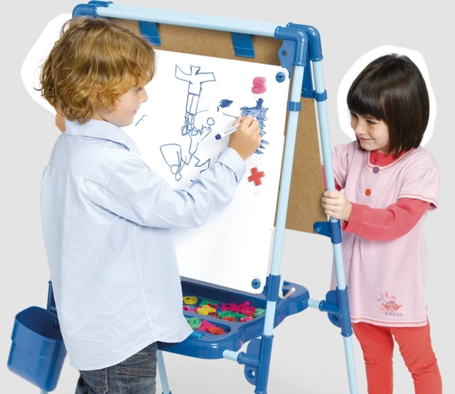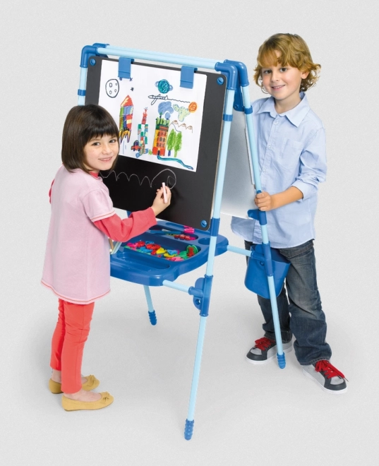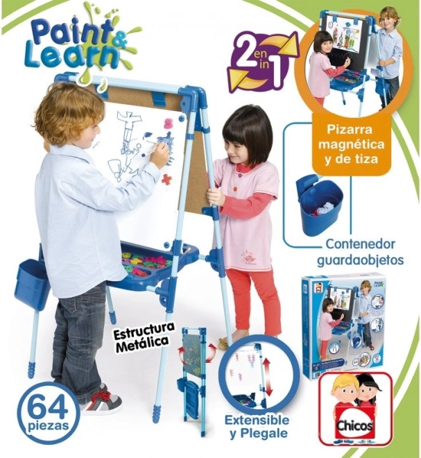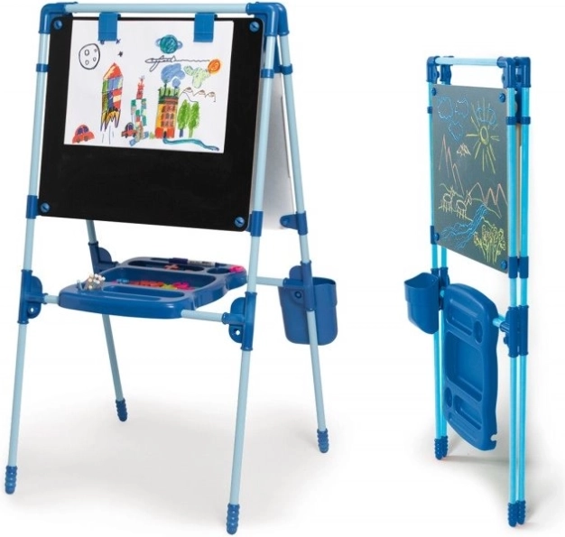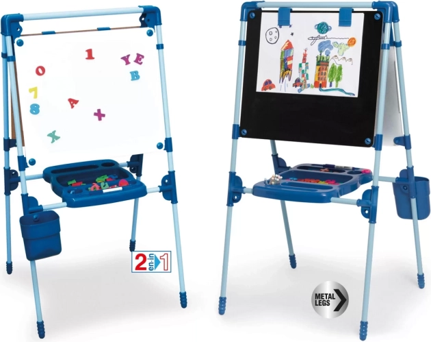 Dwustronna dziecięca tablica 2w1 CHICOS wspiera rysowanie i naukę. Jedna strona jest białą magnetyczną do markerów, druga czarną kredową do tradycyjnych kred. Oferuje regulowaną wysokość, składaną konstrukcję dla łatwego przechowywania, klipsy na papier oraz praktyczną półkę odkładczą. W zestawie znajduje się 64 magnesy do zabawnej nauki liter i cyfr.