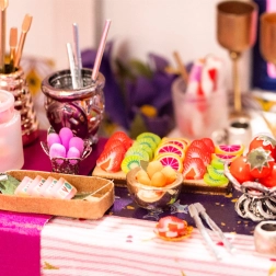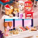 Miniatura zawiera szczegółowe elementy takie jak kolorowe krzesła, stoły i inne dekoracje, które wiernie oddają prawdziwe wnętrza.