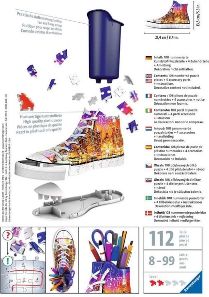 To puzzle 3D oferuje innowacyjny i nieszablonowy kształt dla każdego, kto lubi łączyć elementy i modne dodatki. Dzięki specjalnym zakrzywionym i elastycznym elementom, które idealnie pasują na swoje miejsce, zbudujesz realistycznie wyglądającą tenisówkę z motywem New York City – miasta, które nigdy nie śpi.