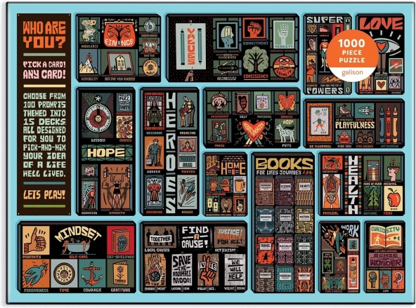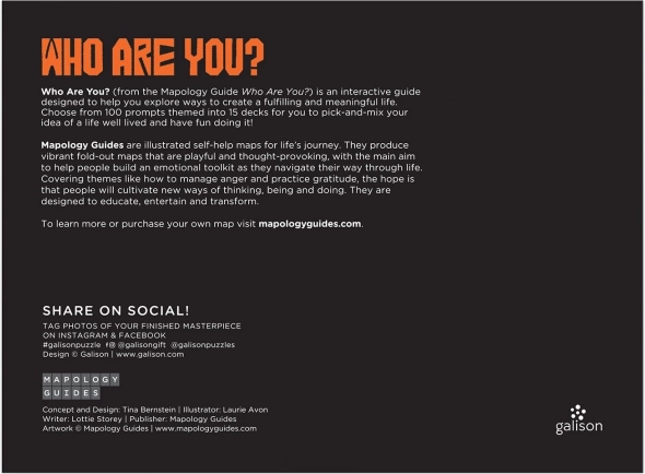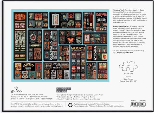 Odkryj inspirujące układanie z puzzlami GALISON Who Are You? o 1000 elementach. Ilustrowana siatka z kolekcji Mapology Guides przynosi afirmacje, pobudzające myśli i motywujące ilustracje w języku angielskim. Idealny prezent dla miłośników designu i uważnego relaksu, w zestawie wzór motywu oraz wygodny format do oprawienia w ramę.
