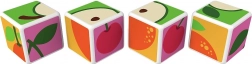 Kolorowe ilustracje jabłka, wiśni, banana, winogron czy pomarańczy wspierają rozpoznawanie kolorów i kształtów oraz poszerzają słownictwo poprzez zabawę.