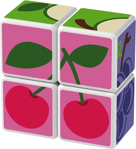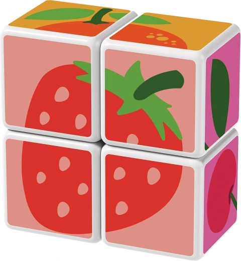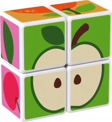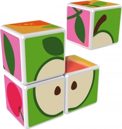 Zestaw Geomag Magicube Owoce zawiera kolorowe magnetyczne klocki z ilustracjami jabłka, truskawki, winogron, wiśni, banana i innych owoców. Dzieci mogą układać obrazki owoców, a także proste konstrukcje 3D jak komin czy zagrodę. Magnesy wewnątrz klocków zapewniają łatwe łączenie i stabilność modeli, dzięki czemu zabawa jest intuicyjna, przyjemna i bez frustracji.