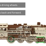 Lokomotywa wykorzystuje silnik gumowy i koła zębate, więc po naciągnięciu naprawdę jeździ do przodu i do tyłu. Przekładnie i tłoki zobaczysz bezpośrednio w akcji.