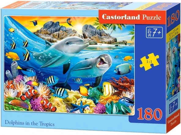 Po ułożeniu powstaje szczegółowy obrazek z tropikalnymi delfinami, który świetnie nadaje się do wyeksponowania w pokoju dziecięcym. Puzzle wykonane są z wysokiej jakości materiału z precyzyjnymi wycięciami, dzięki którym elementy dobrze trzymają się razem.