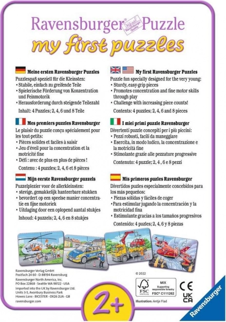 Moje pierwsze puzzle – Pojazdy ratunkowe od marki RAVENSBURGER przynoszą małym dzieciom radość z sukcesu podczas układania. Każdy z obrazków ma inną liczbę elementów, dzięki czemu dzieci naturalnie przechodzą od prostszej układanki do trudniejszej i budują zdrową pewność siebie.