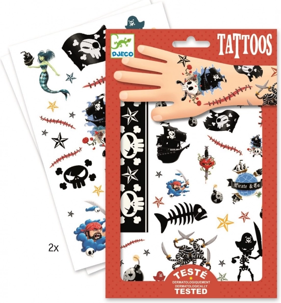 Wyrusz w przygodę na szerokie morze z tymczasowymi tatuażami DJECO o pirackiej tematyce. Delikatne ilustracje, nasycone kolory i zabawne motywy ucieszą dzieci i rodziców – niezależnie od tego, czy chodzi o urodzinowe przyjęcie, karnawał, czy nagrodę za starania.