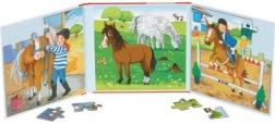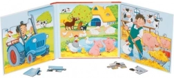 Odkryj wspaniale ilustrowaną magnetyczną książkę z puzzlami z motywami gospodarstwa, która oferuje aż 4 obrazki. Dwa z nich to puzzle, każde z 20 magnetycznymi elementami, które świetnie się trzymają. Książka wykonana jest z solidnej tektury, co czyni ją trwałą i praktyczną w podróży. Pomaga rozwijać małą motorykę i logiczne myślenie dzieci.