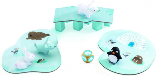 Zestaw zawiera 4 szczegółowo wykonane figurki zwierzątek (pingwin, niedźwiedź polarny, biała lisica, biały króliczek), 3 plansze z motywem lodu, specjalne elementy jak przeręble, most, planszę igloo oraz 6 filarów. Dzięki prostym zasadom i atrakcyjnemu wykonaniu gra jest idealna jako pierwsze kooperacyjne doświadczenie dla przedszkolaków.