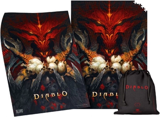 Te puzzle przedstawiają ikoniczne dzieło artystyczne z serii gier Diablo, ukazujące demoniczne oblicze otoczone czaszkami.