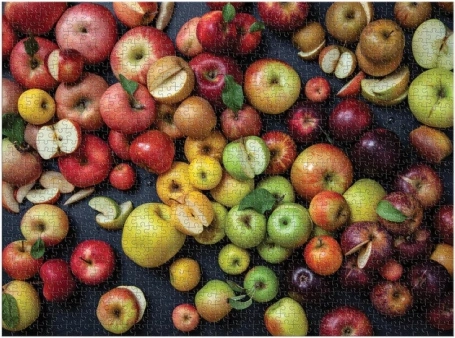 Grafika na puzzlach ukazuje barwną gamę odmian jabłek, co podczas układania zapewnia estetyczne doznania.