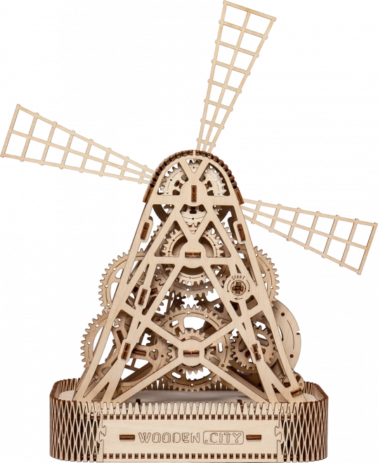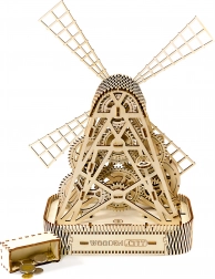 Po nakręceniu napędem gumowym łopaty młyna zaczynają się obracać, a dzięki kołowi zamachowemu między zębatkami można cieszyć się zabawą aż minutę po jednym nakręceniu. Zintegrowana schowka w podstawie oferuje praktyczne zastosowanie jako skarbonka lub miejsce do przechowywania drobiazgów.