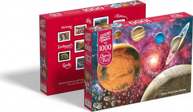 Delektuj się spokojnymi chwilami, układając motyw kosmosu nad księżycowym horyzontem, który po ukończeniu zamienia się w obraz o wymiarach ok. 70 × 50 cm. Dzięki 1000 elementom zapewnia przyjemne wyzwanie i piękny efekt, który warto wyeksponować.