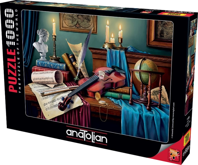 Puzzle ANATOLIAN Stół skrzypka 1000 elementów z praktycznym stojakiem i możliwością dosłania brakującego elementu. Wymiary po ułożeniu ok. 66 × 48 cm.