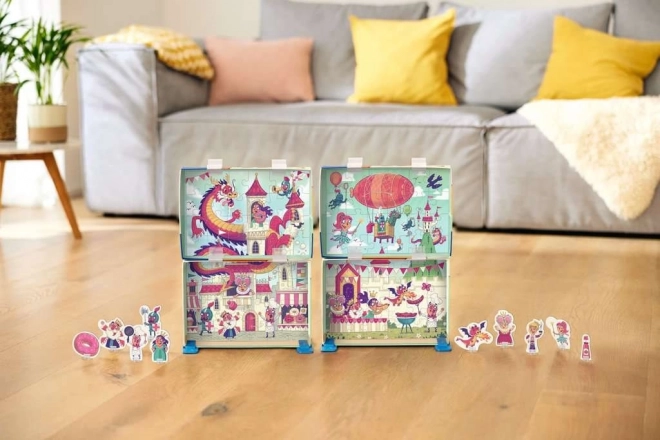 W zestawie znajdują się również klipsy mocujące oraz figurki do zabawy, które pozwalają ożywić scenę. Puzzle układa się bezpośrednio w pudełku, które służy jako tło scenki – praktyczne, zabawne i idealne w podróży.