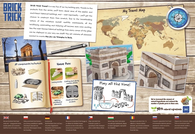Starannie zaprojektowany zestaw Brick Trick Travel pozwala zbudować kultowy Łuk Triumfalny, jeden z najsłynniejszych symboli Paryża, używając prawdziwych cegiełek. Zyskasz nie tylko piękny model, ale też okazję do nauki nowych umiejętności, takich jak układanie i klejenie. Wyraź swoją kreatywność z pomocą dołączonych dekoracji i papierowych figurek.