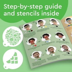 Zestaw zawiera 8 kolorów wysokiej jakości, szablony do łatwego tworzenia motywów, gąbki, pędzel i ilustrowaną instrukcję, dla początkujących i zaawansowanych użytkowników. Łatwe do zmycia wodą i mydłem, co zapewnia łatwe usunięcie.