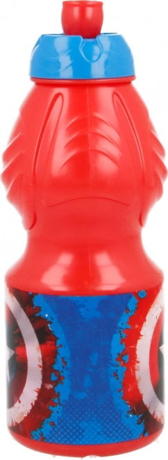 Plastowa butelka na napoje o pojemności 400 ml z ergonomicznym kształtem, bezpiecznym korkiem i antypoślizgowym uchwytem. Idealna dla fanów Kapitana Ameryki!