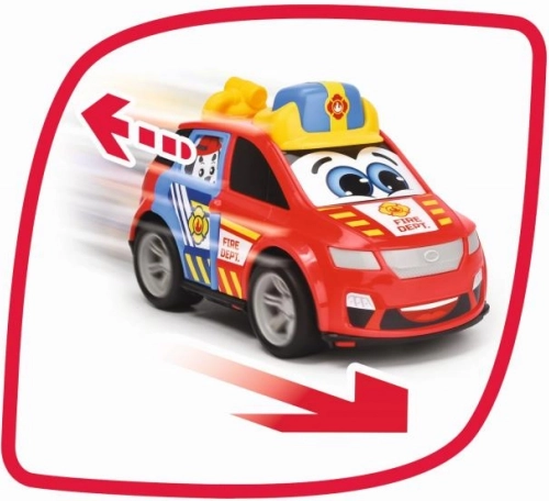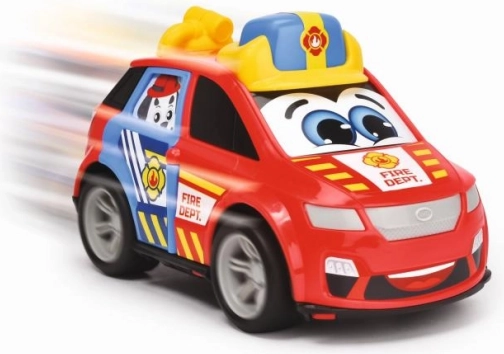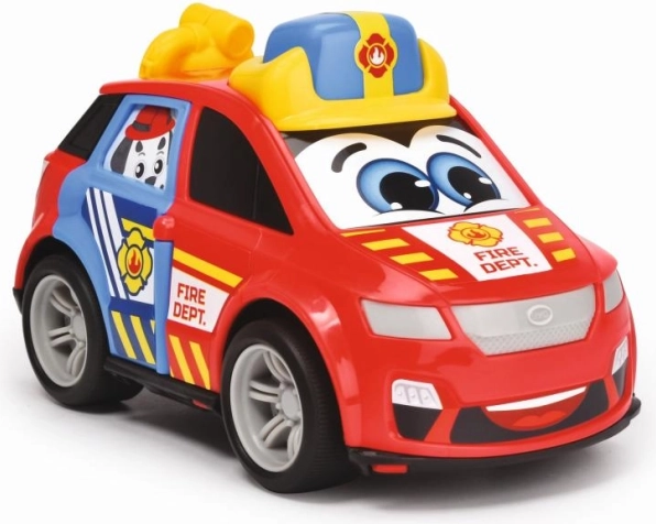 Czerwony wóz strażacki z wyrazistymi oczami i wesołą twarzą jest gotowy do akcji. Żywe kolory i insygnia strażaków czynią z tego auta świetny dodatek do każdej zabawy.