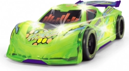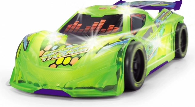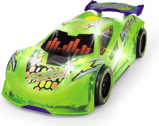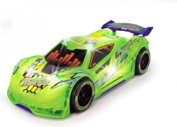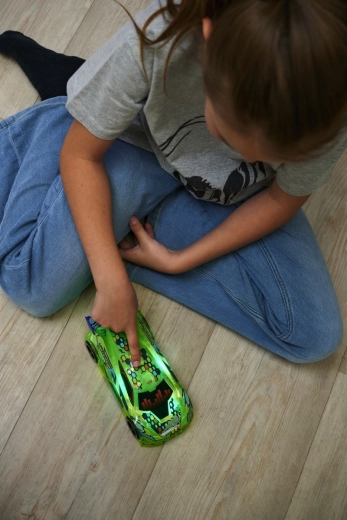 Auto posiada świecące światła i rytmiczną muzykę, która towarzyszy każdej jeździe.